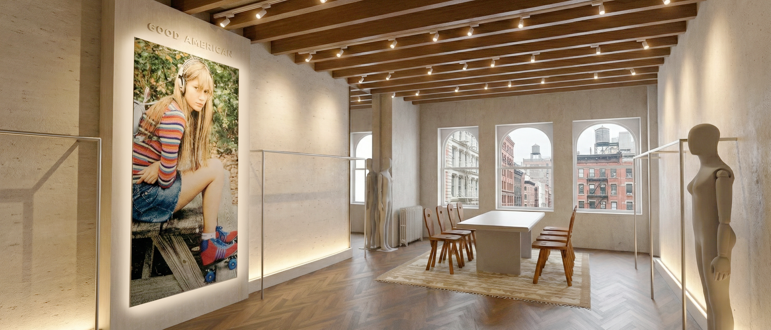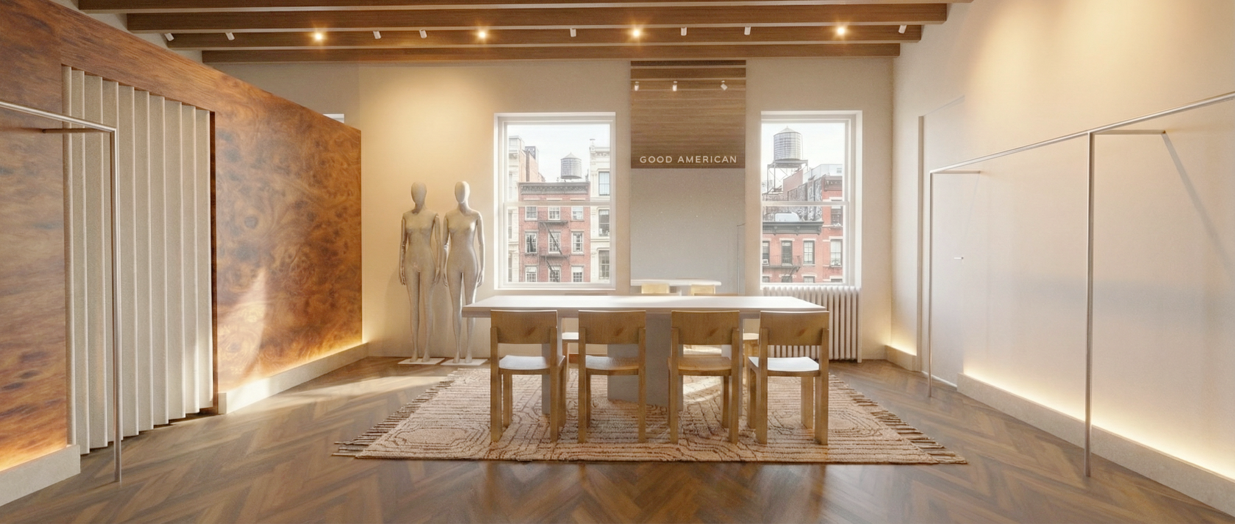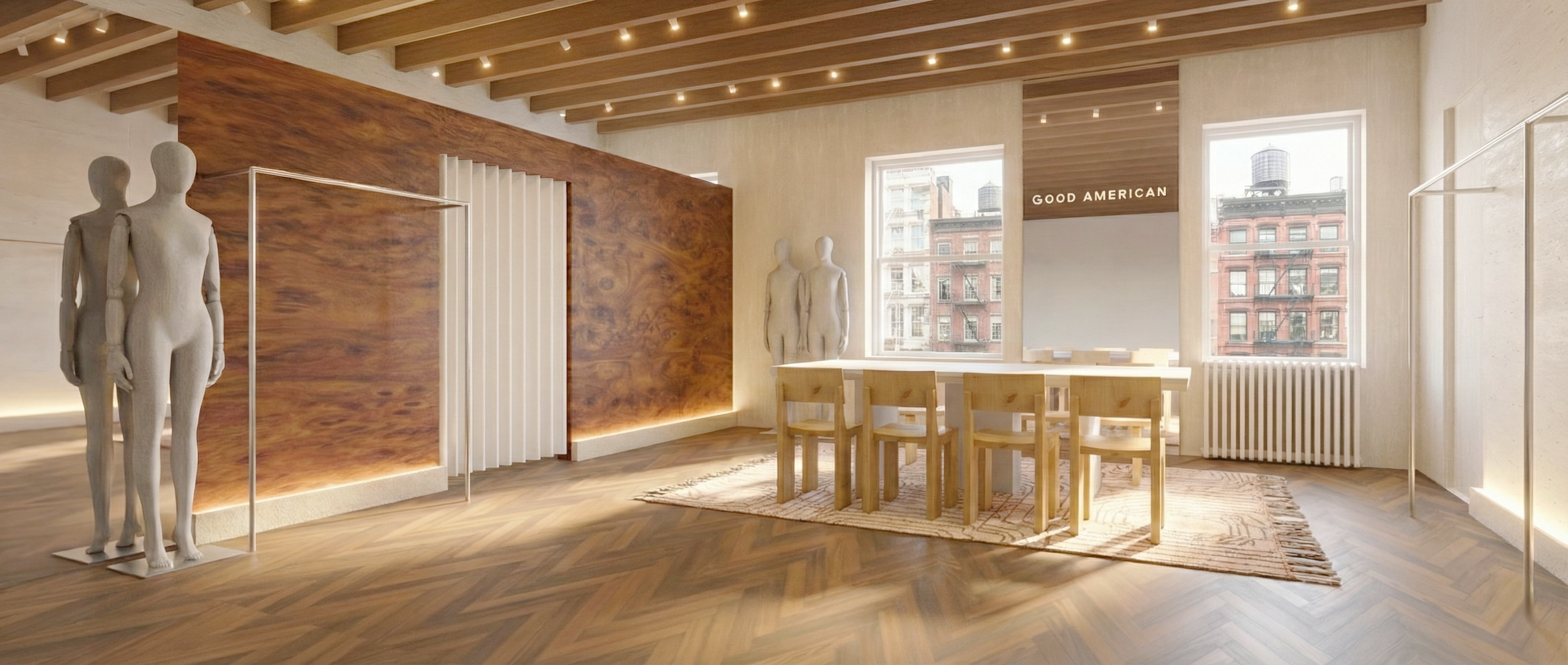 The result is a refined yet approachable showroom that feels unmistakably New York, where heritage architecture and Good American’s modern identity coexist seamlessly.
