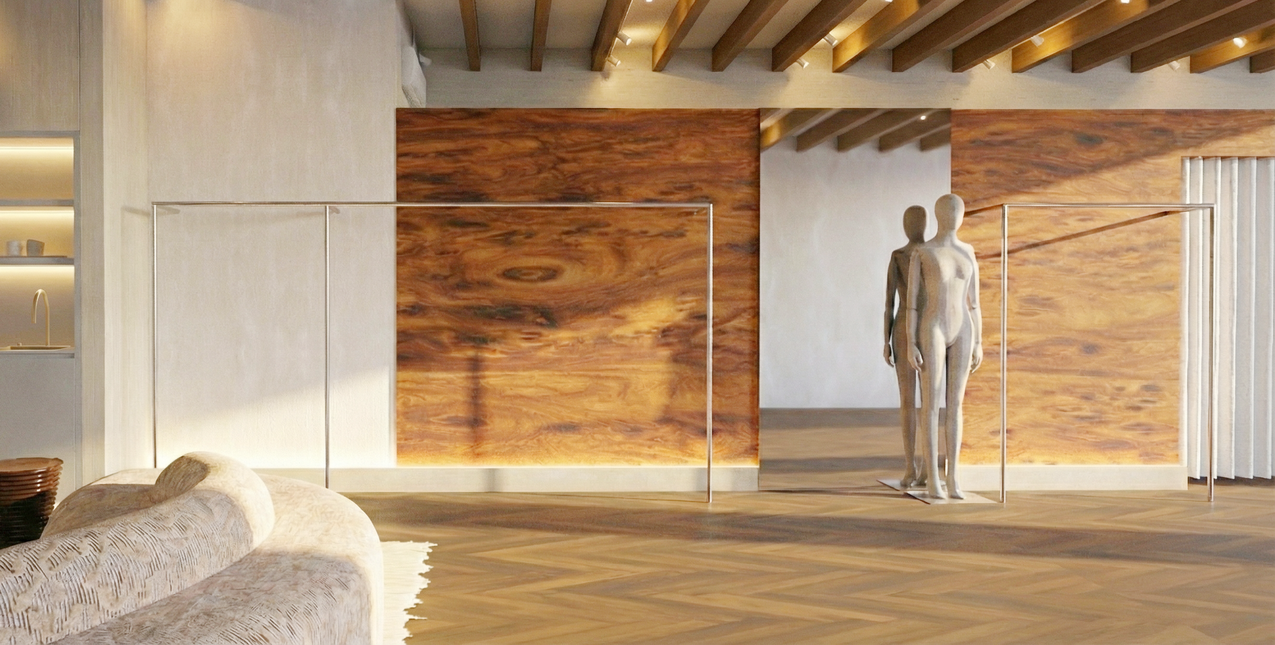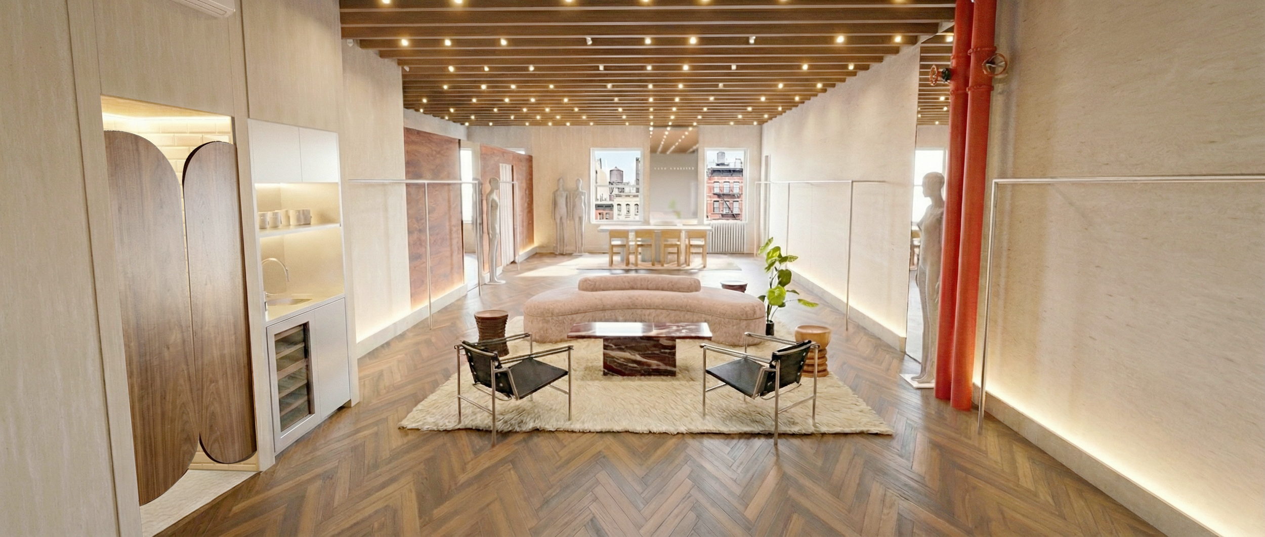 Set on a coveted stretch of Great Jones Street in the heart of NoHo, this Good American showroom is housed within a classic New York loft building rich with architectural character. Exposed rafters and original chevron wood floors ground the space in the neighborhood’s industrial past, creating a backdrop that feels both storied and distinctly downtown.