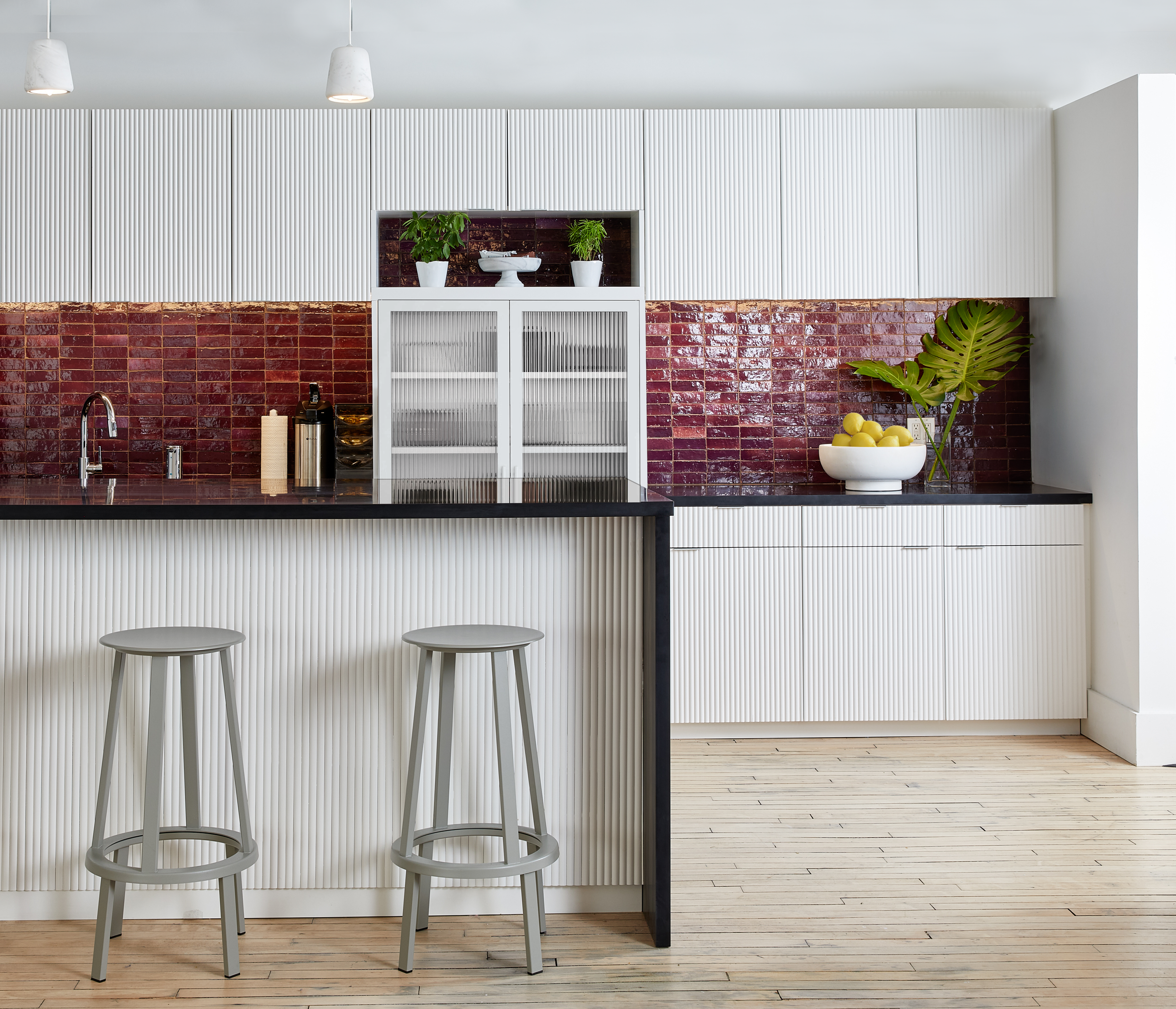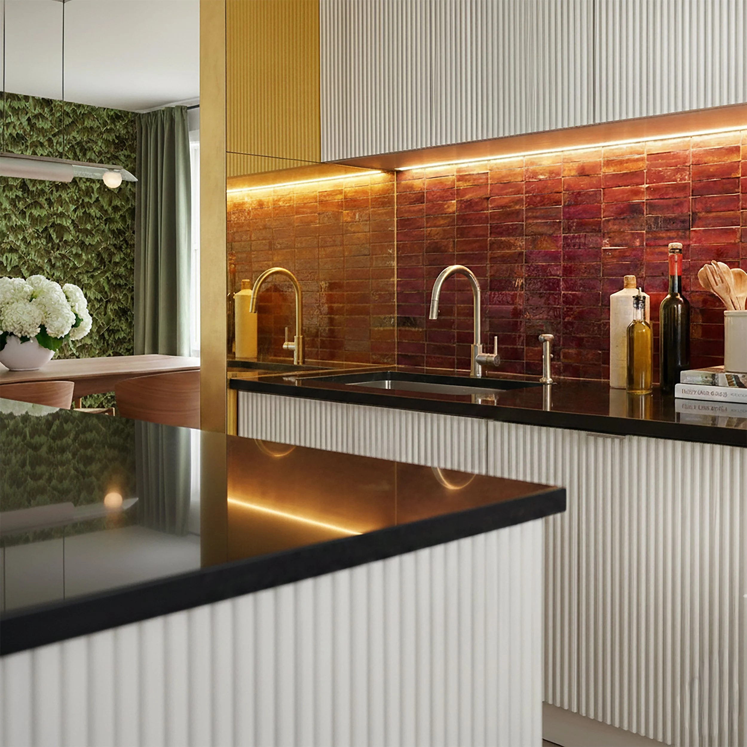 The project began by re-centering the kitchen and dining area as the heart of the home, designed to support both everyday living and entertaining. Unified cabinetry and integrated appliances are clad in sleek tambour and paired with handmade zellige tiles in deep plum tones, introducing tactile contrast. A custom partition wrapped in gold mirror subtly separates the kitchen and dining room while reflecting light and creating a stronger visual connection between the two spaces.
