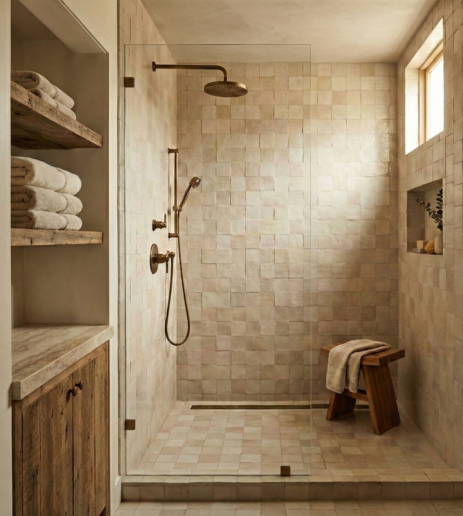 The bedroom takes a more restrained approach, designed as a place to slow down and unwind. Deep, muted green plaster walls are balanced with a brown velvet-upholstered headboard, creating an enveloping and tactile atmosphere. The primary bathroom continues this calm through a simple, monochromatic material palette, offering a quiet retreat from the pace of city life.