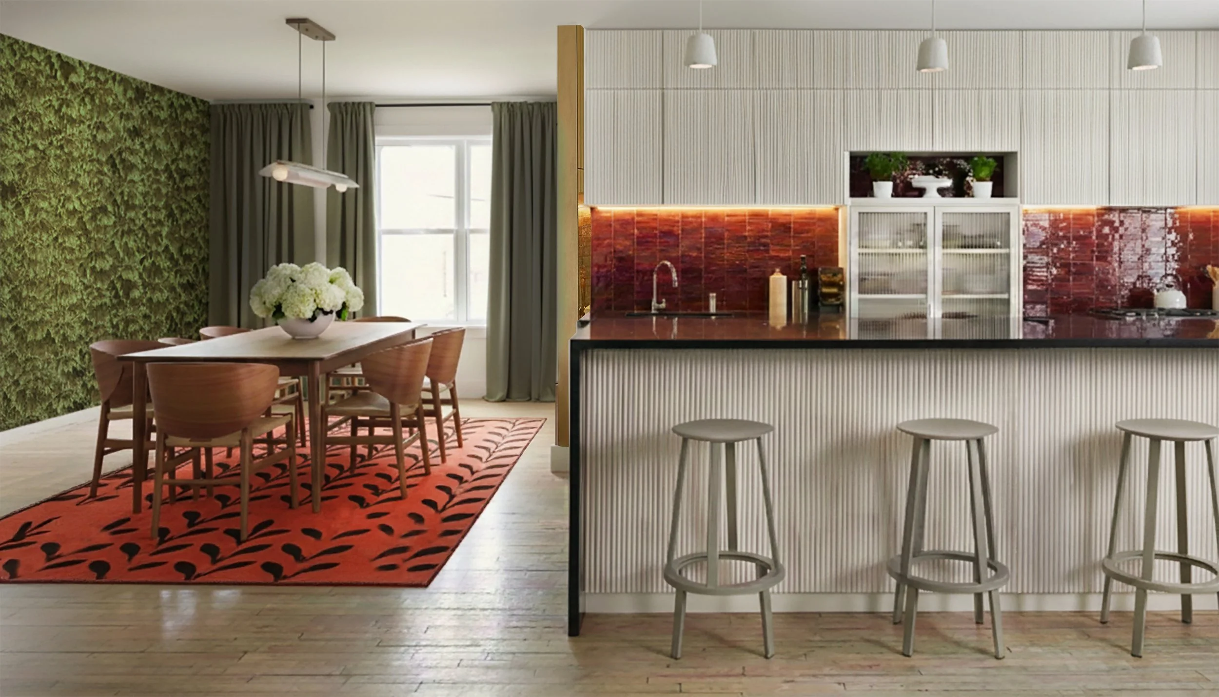 In the dining room, a saturated palette of terracotta and forest green sets the tone for gathering and hosting. Plush, handwoven rugs and bespoke wallpaper reinforce the richness of the space, bringing warmth, depth, and a sense of ease.