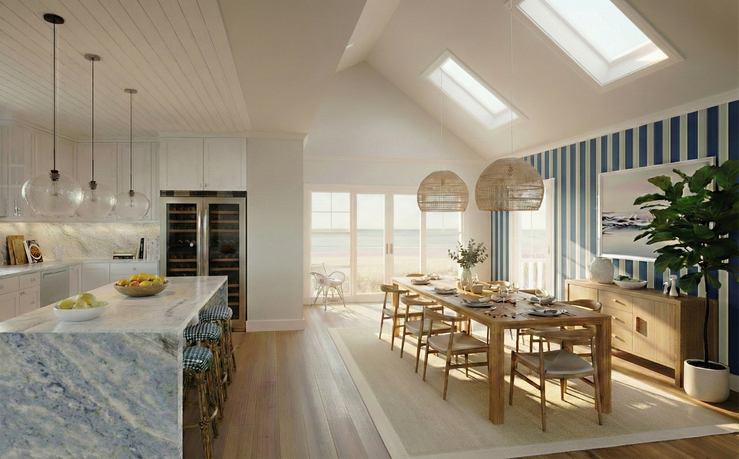 A palette of sun-washed neutrals, soft blues, hand-painted wallcoverings and natural textures reinforces the coastal setting. Finishes were selected for durability, ensuring the home performs just as well during lively summer weekends as it does in quieter winter months.