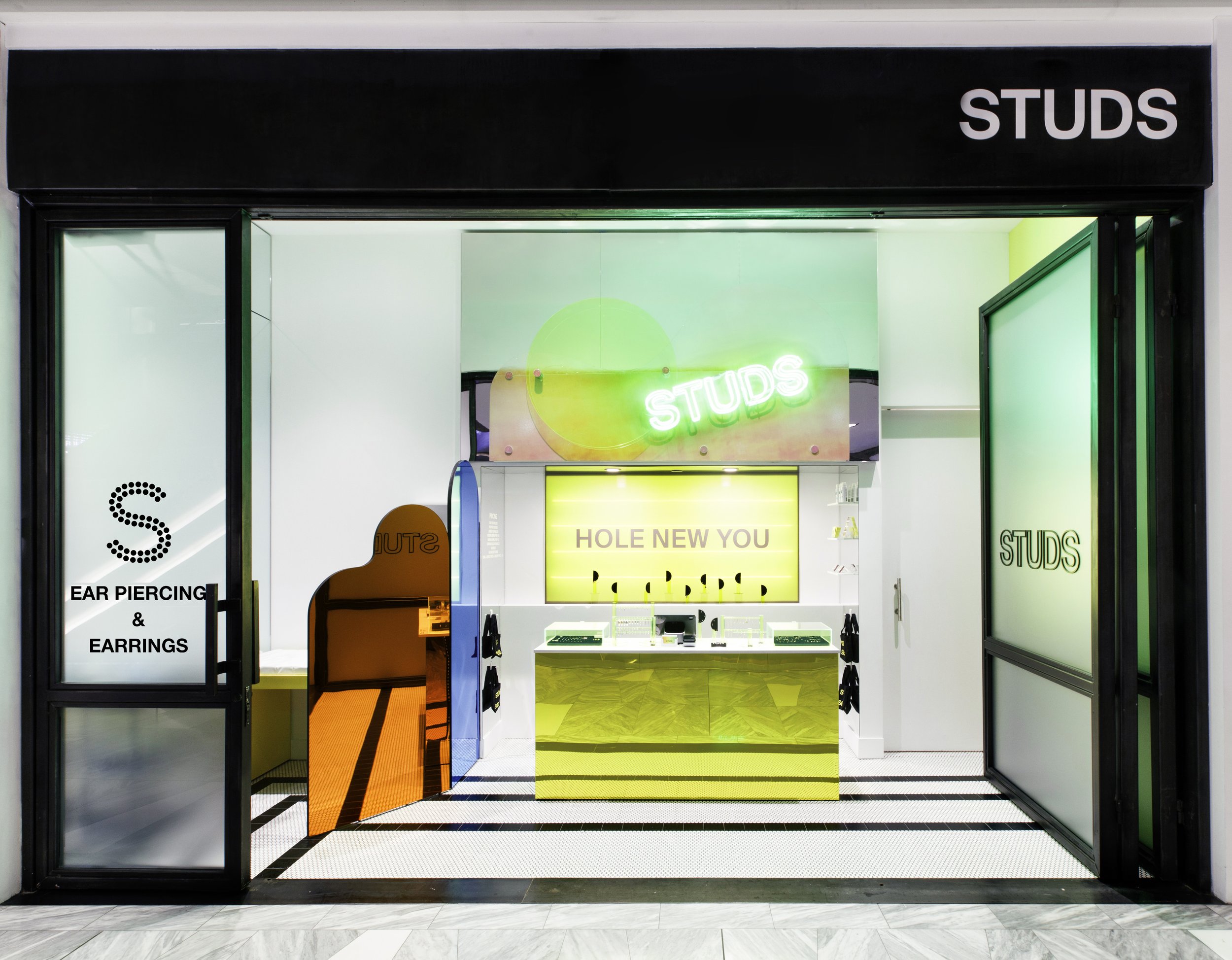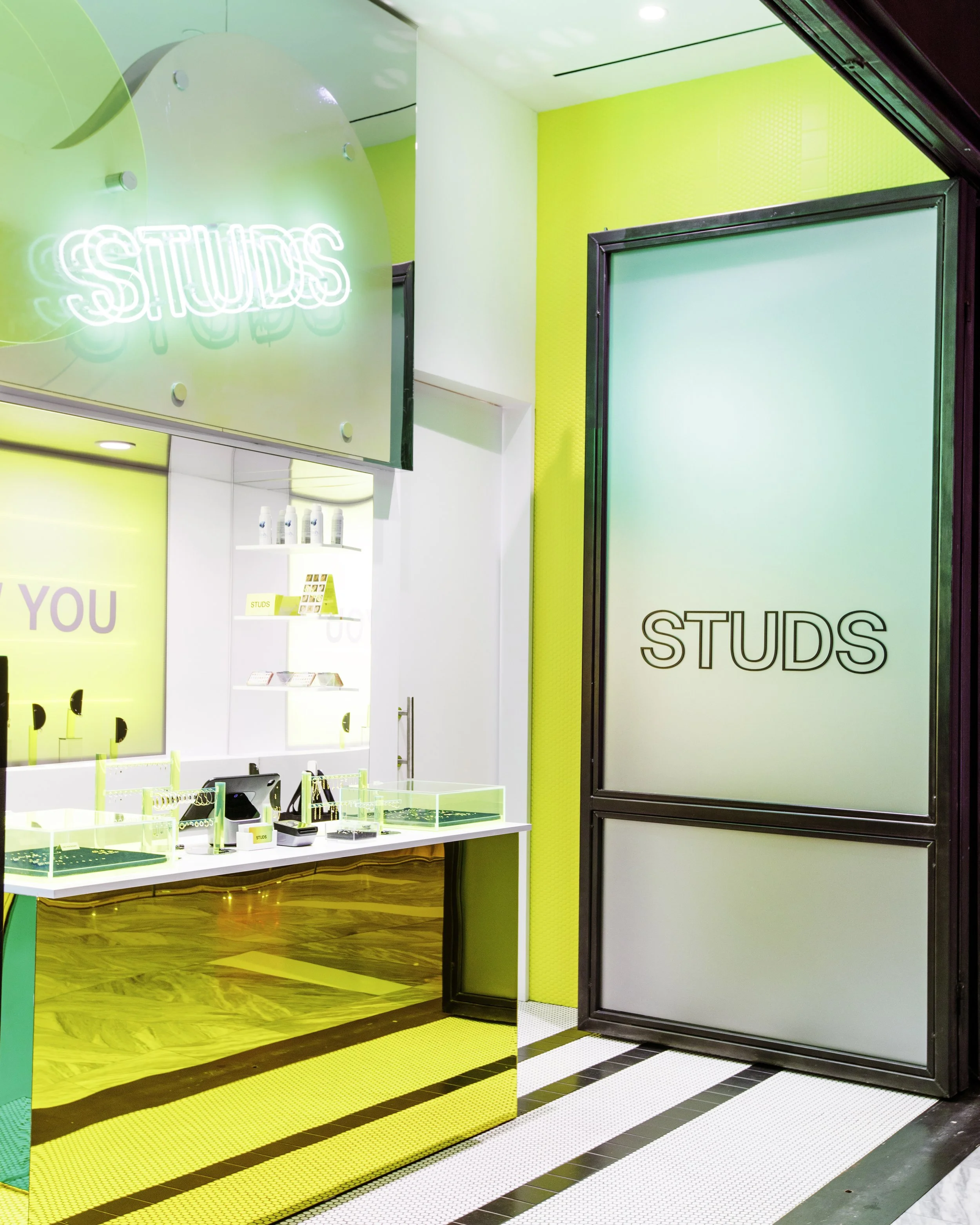 This is the second retail location for Studs, designed by HUXHUX Design Inc. It is located inside the Hudson Yards shopping mall. This further develops the brand direction for Studs while exploring a small format, high impact piercing studio. The store offers a piercing room for one customer. The full collections of both fashion and piercing jewelry is offered at the reflective central counter.