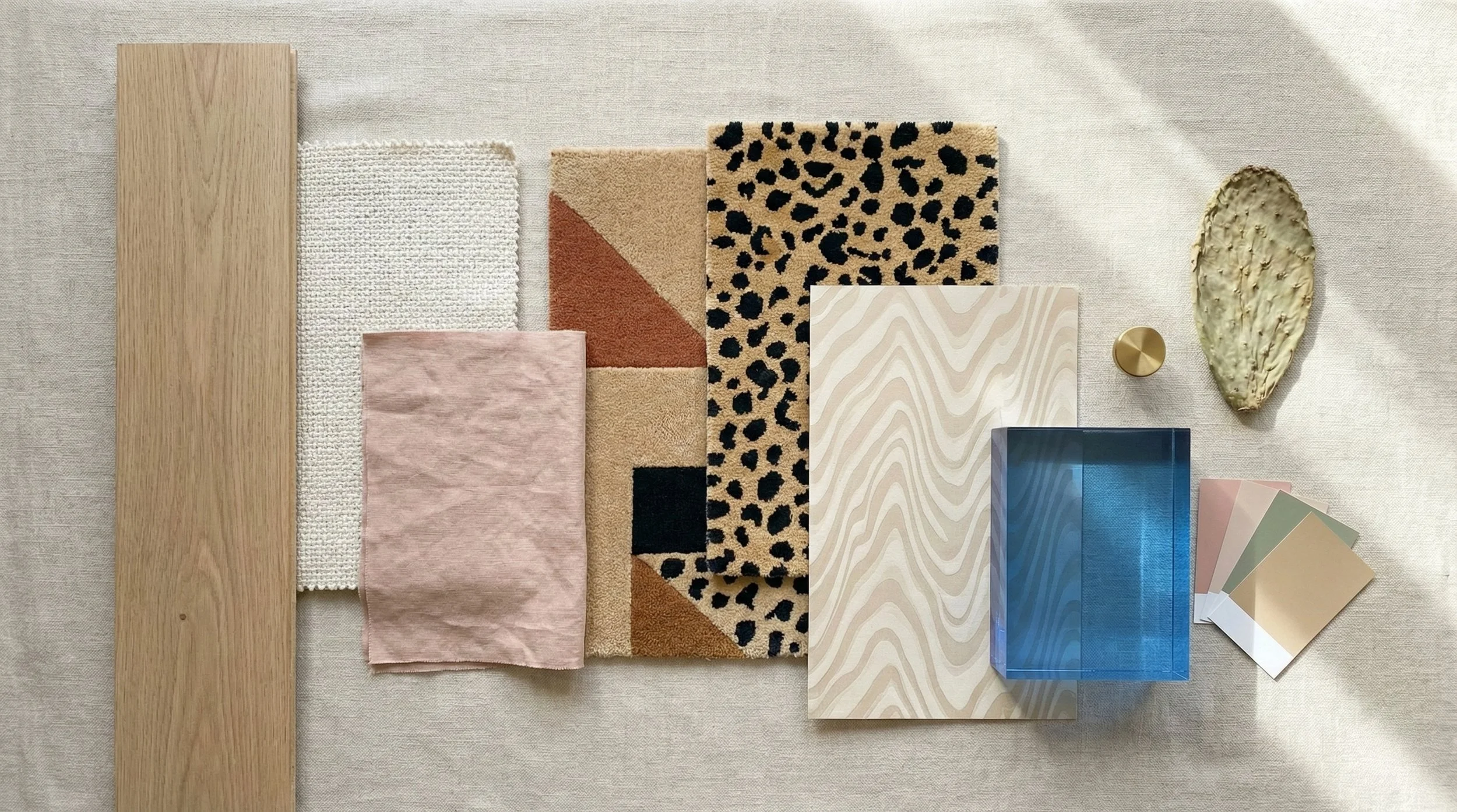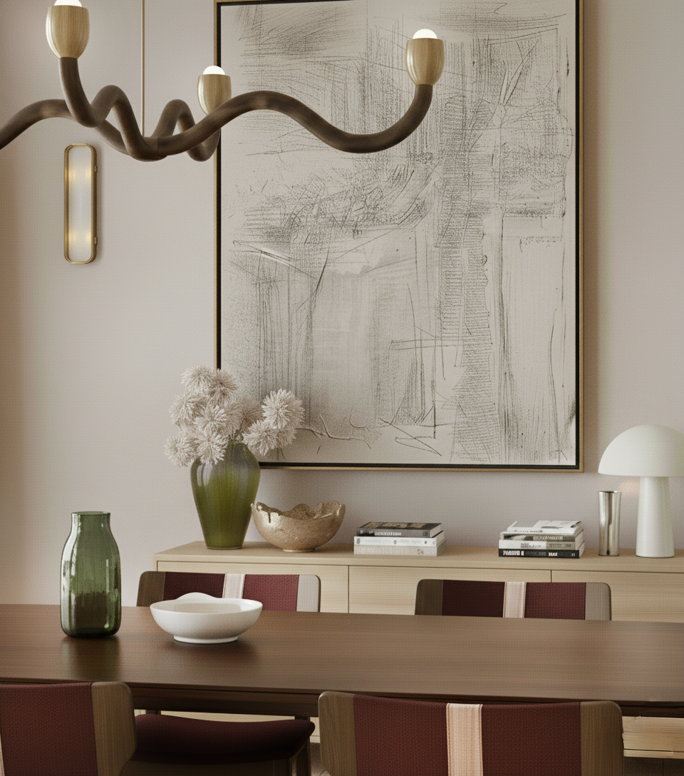 Warm woods, tactile neutral textiles, and earthy accents come together to create a layered and cohesive environment that feels relaxed yet expressive. A custom wallcovering, designed specifically for the project, brings movement and energy to the main living space and serves as a defining focal point.